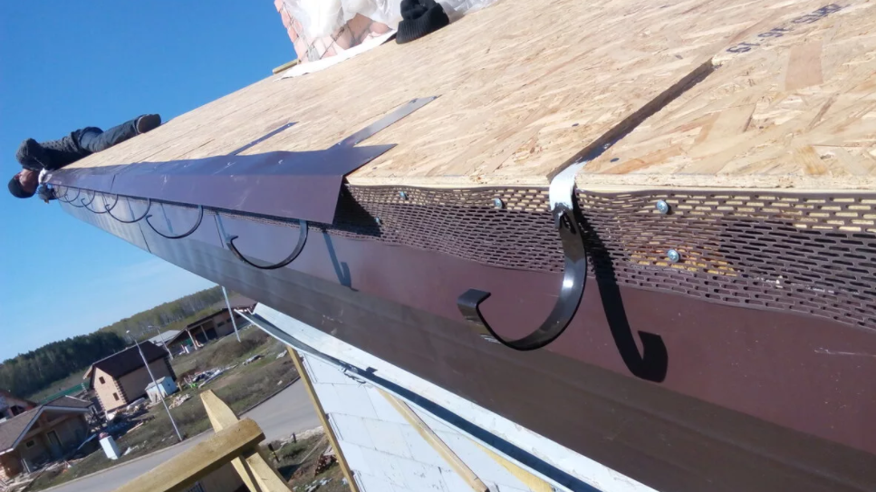 Начинают укладку с монтажа капельника для удаления конденсата и влаги из зазора между слоями кровельного пирога, крепление кронштейнов для подвесных водосточных желобов. Далее на первую доску набивают стартовую карнизную планку, последующие элементы размещают внахлест на 5-10 см.