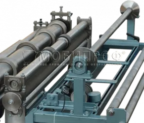 Les guides ajustables permettent de couper du métal de différentes largeurs. Pour assurer la fourniture progressive du métal à la machine, deux axes de guidage sont installés devant les guides. Deux arbres, dont l'un avec un revêtement en caoutchouc, sont situés après l'unité de coupe longitudinale, ils créent une force supplémentaire pour tirer le métal et maintiennent ses déplacements pendant la coupe transversale.